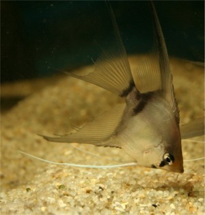 Blushing Angelfish are homozygous for the stripeless gene. Not only do stripeless fish lack the distinctive vertical bands, their skin is lacking in reflective iridophores. Because of this the red gill colour shows through the translucent oppercula of young fish - hence the name. As they age the gills lose their translucence and random patches of iridophores develop giving the fish a beautiful mother of pearl appearence.